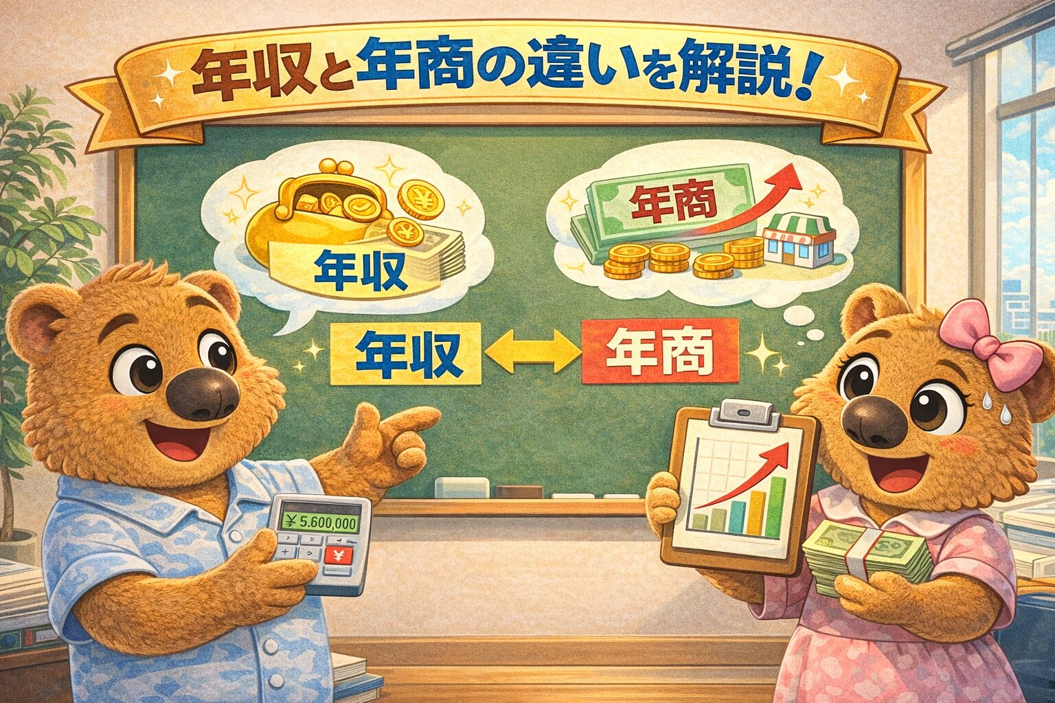 年収は個人が1年で受け取るお金、年商はお店や会社が1年で売った商品の合計です。