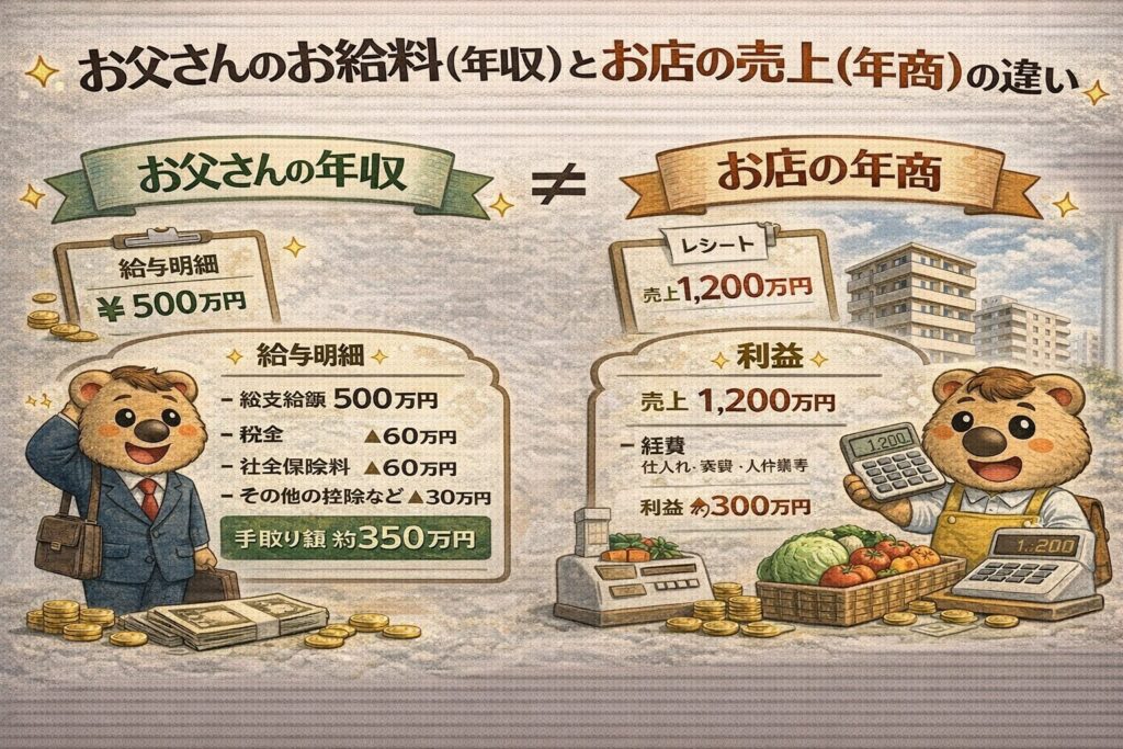 でもここで注意! 1,000万円の売上があっても、材料代・お店の家賃・人件費などの経費を引くと、 家族が手元に受け取れるお金(利益)は少ないことがあります。