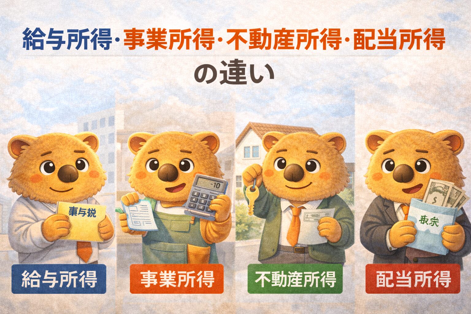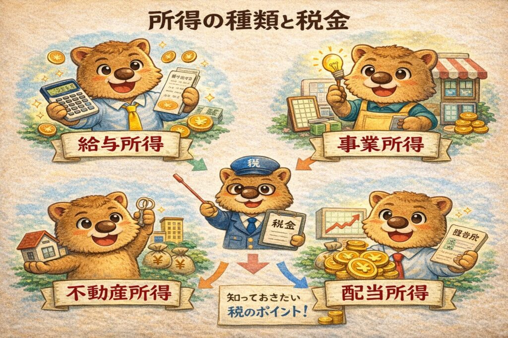 こんにちは!今回は「所得」について、特に 給与所得・事業所得・不動産所得・配当所得 の違いをわかりやすく整理します。