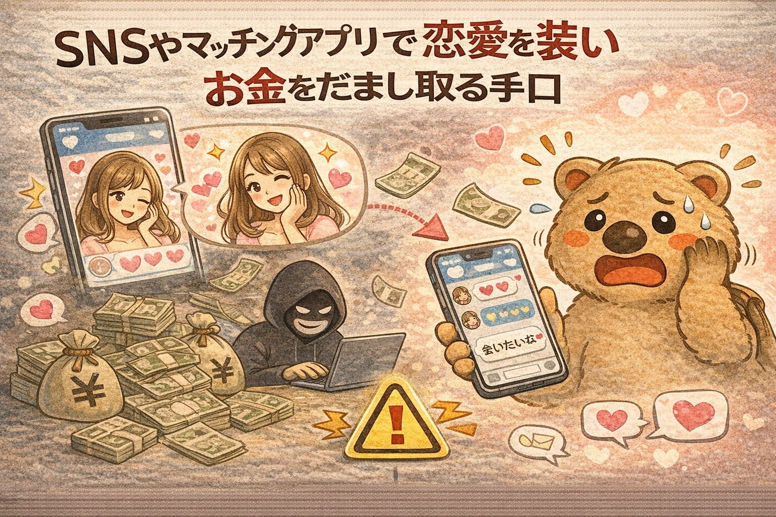 ロマンス詐欺とは、SNSやマッチングアプリなどで恋人のようにふるまい、 相手を信じさせてお金をだまし取る詐欺のことです。