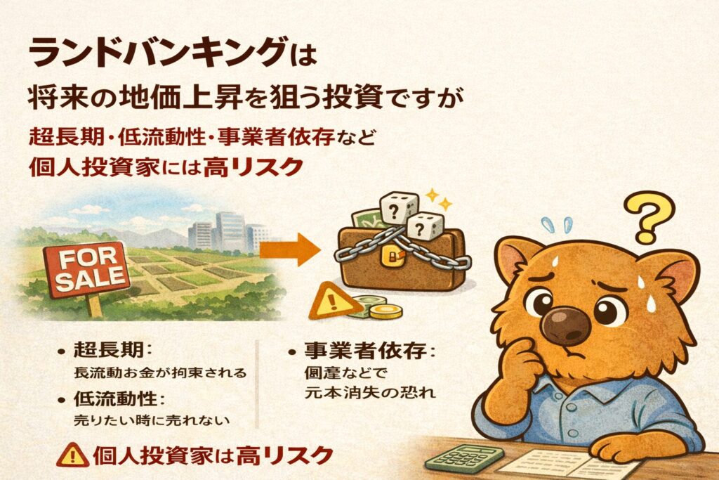ランドバンキングは一見すると夢のある投資に見えますが、 実態は超長期・低流動性・事業者依存という三重苦を抱えた商品です。