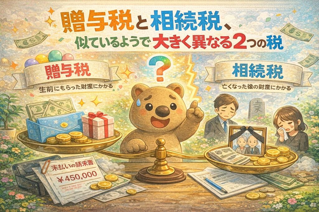 こんにちは。今回は「贈与税」と「相続税」の違いに焦点を当てて、大人・保護者・資産を引き継ぐ立場の方に向けて分かりやすく解説します。